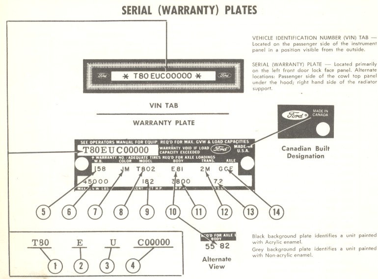 1968 Ford Serial (Warranty) Plate Breakdown Note: This is the same as on my 1967 Ford F100 that was built in Canada. The truck does not have the VIN Tab next to the windshield.